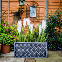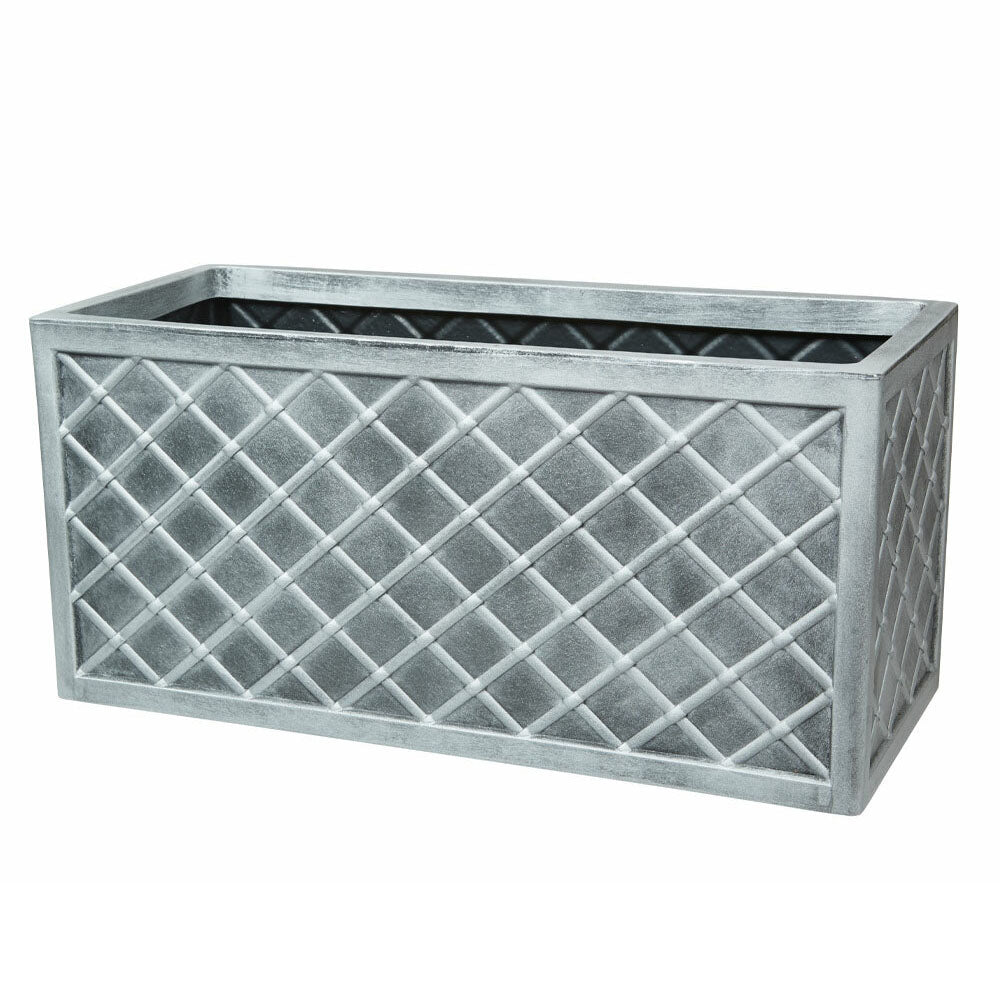 The Strata Lazio Trough is a large capacity plastic lazio trough. Traditional lattice detailing and hand painted with a pewter finish. Perfect for patios and gardens. Made in the UK from recycled materials.